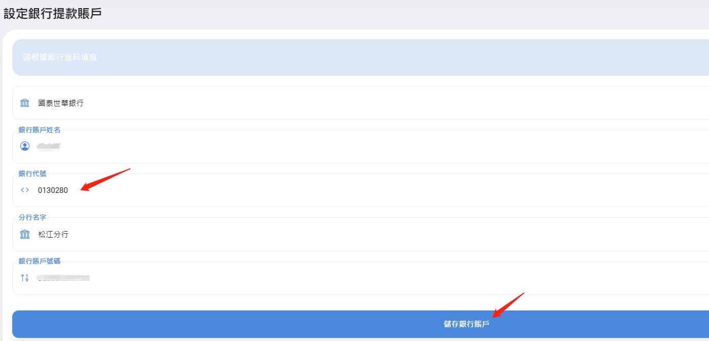 設定個人銀行提款資訊時,請特別留意銀行代碼需填寫七個位數,如下圖所示: